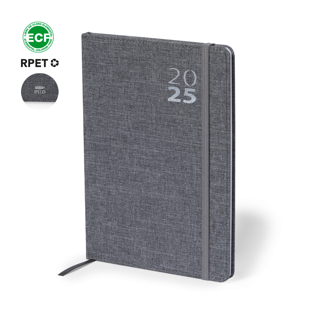 Descriptif : Agenda format A5 en polyester RPET souple. Avec couvertures rigides et fermeture élastique. Avec badge RPET.Conception de la vue hebdomadaire, zone dannotation et signet en tissu. En 2 langues : espagnol et anglais. Présenté dans une boîte design Kraft.Le matériau RPET est fabriqué à partir de plastique recyclé, afin de favoriser la réutilisation des déchets plastiques et daider à la durabilité de la planète.