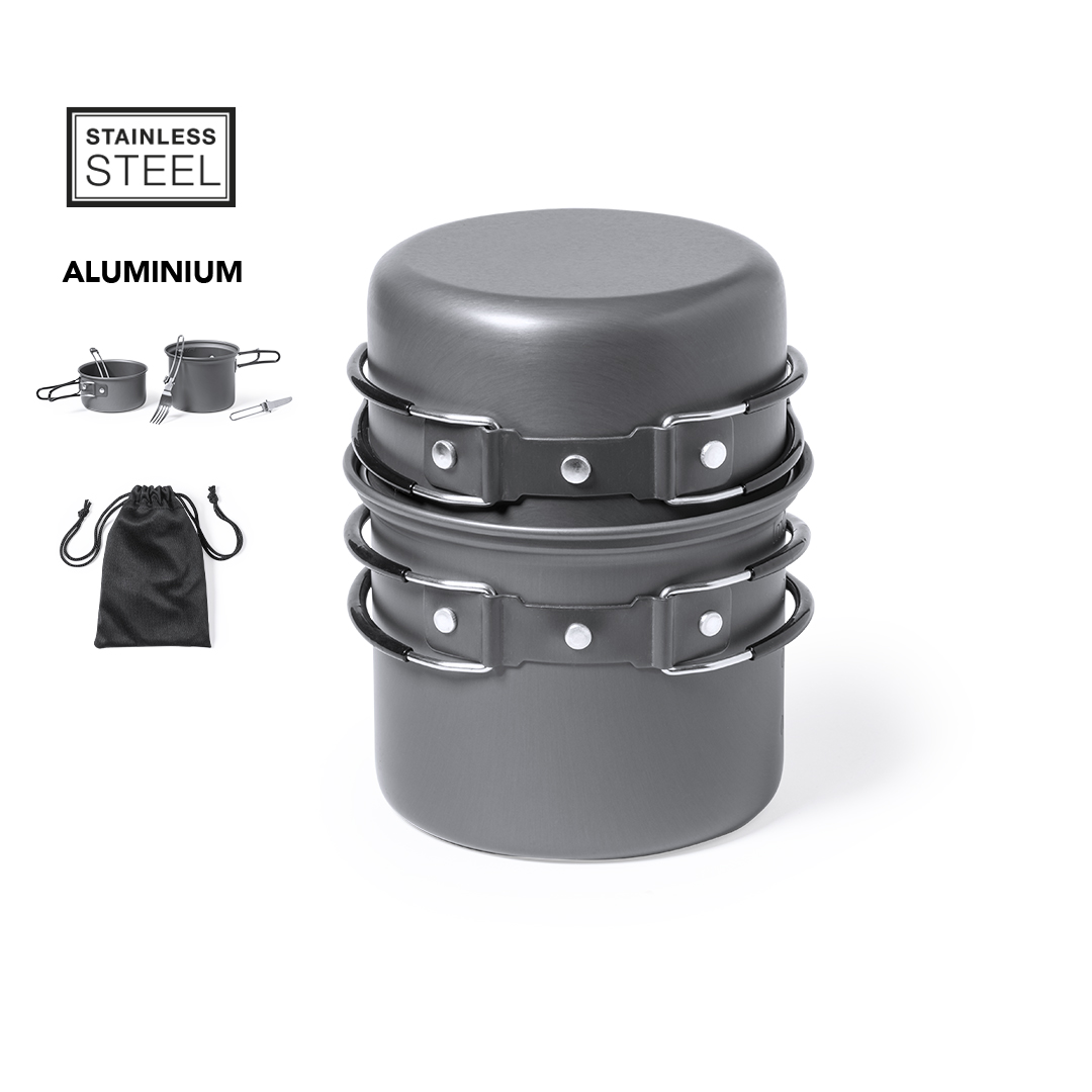 Descriptif : Ensemble complet dustensiles de camping ultra-compacts. Présenté dans une gaine RPET résistante avec une fermeture à cordon, un accessoire de réglage et une étiquette extérieure avec le logo RPET. Contenu:1 pot en aluminium finition gris mat. capacité de 800 ml 13 cm de diamètre x 10 cm de haut. Poignées rabattables avec protection anti-brûlure.1 pot en aluminium finition gris mat. capacité de 600 ml 12 cm de diamètre x 6,5 cm de haut. Poignées rabattables avec protection anti-brûlure.Cuillère, couteau et fourchette pliants en acier inoxydable. Avec poignée estampée et fermetures de sécurité. Présenté dans un étui individuel en RPET avec fermeture à lacets.Le matériau RPET des housses est fabriqué à partir de plastique recyclé, afin dencourager la réutilisation des déchets plastiques et daider à la durabilité de la planète.